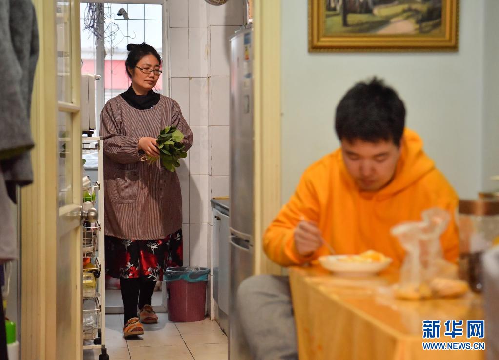 在天津市河北区一居民楼,照顾张昊做完晚餐后,吴桂香依旧在厨房里忙碌(3月29日摄)。新华社发(孙凡越摄)