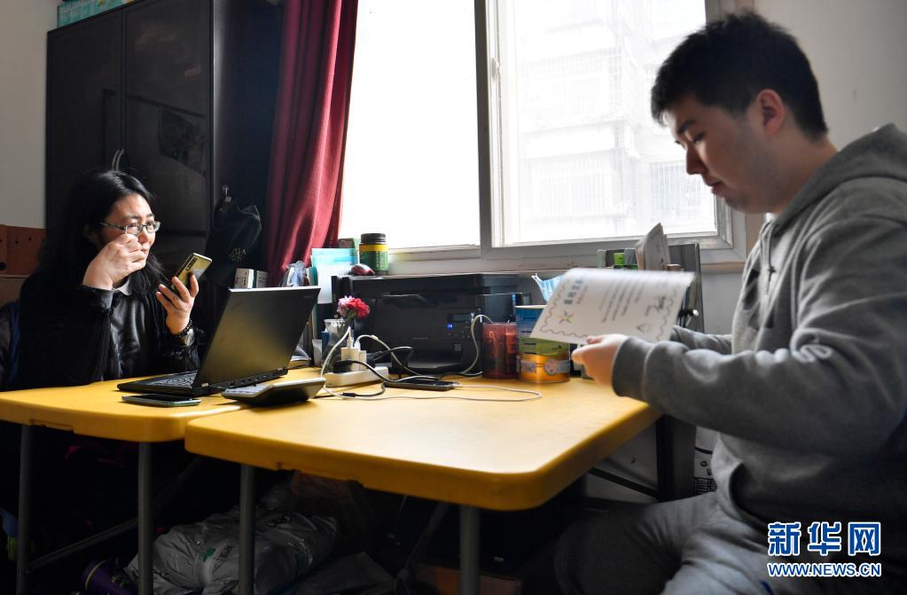 在亚杜兰学坊,吴桂香在工作之余会时不时地注视儿子的举动(3月30日摄)。新华社记者 李然 摄