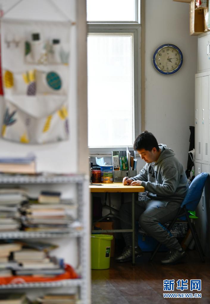 在天津市河东区亚杜兰学坊,张昊在吴桂香的办公室里写字(3月30日摄)。新华社发(孙凡越摄)