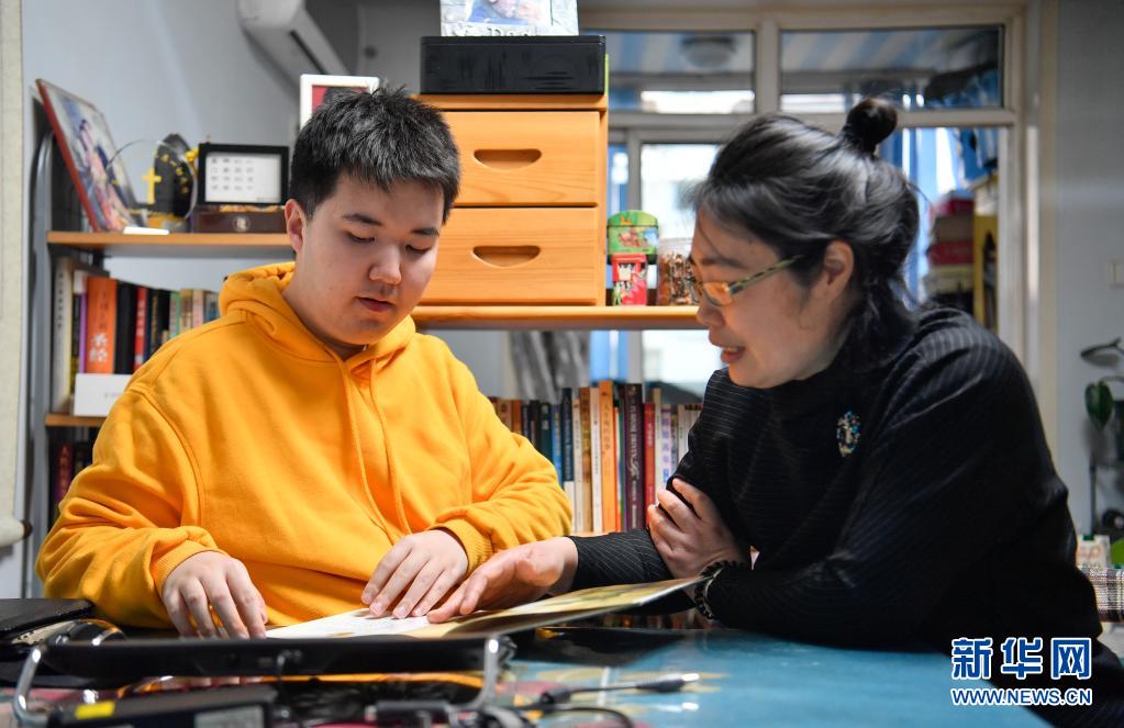 在天津市河北区一居民楼,回家后的吴桂香(右)带领张昊(左)阅读绘本(3月29日摄)。新华社发(孙凡越摄)