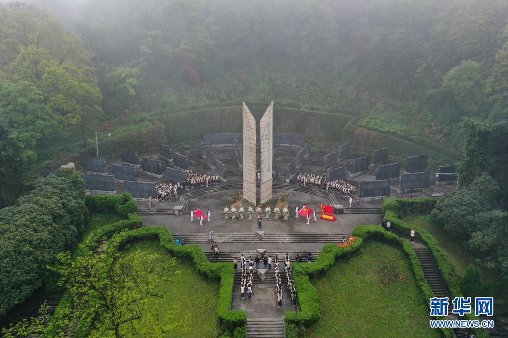 4月2日,师生在南京抗日航空烈士纪念碑广场凭吊先烈(无人机照片)。