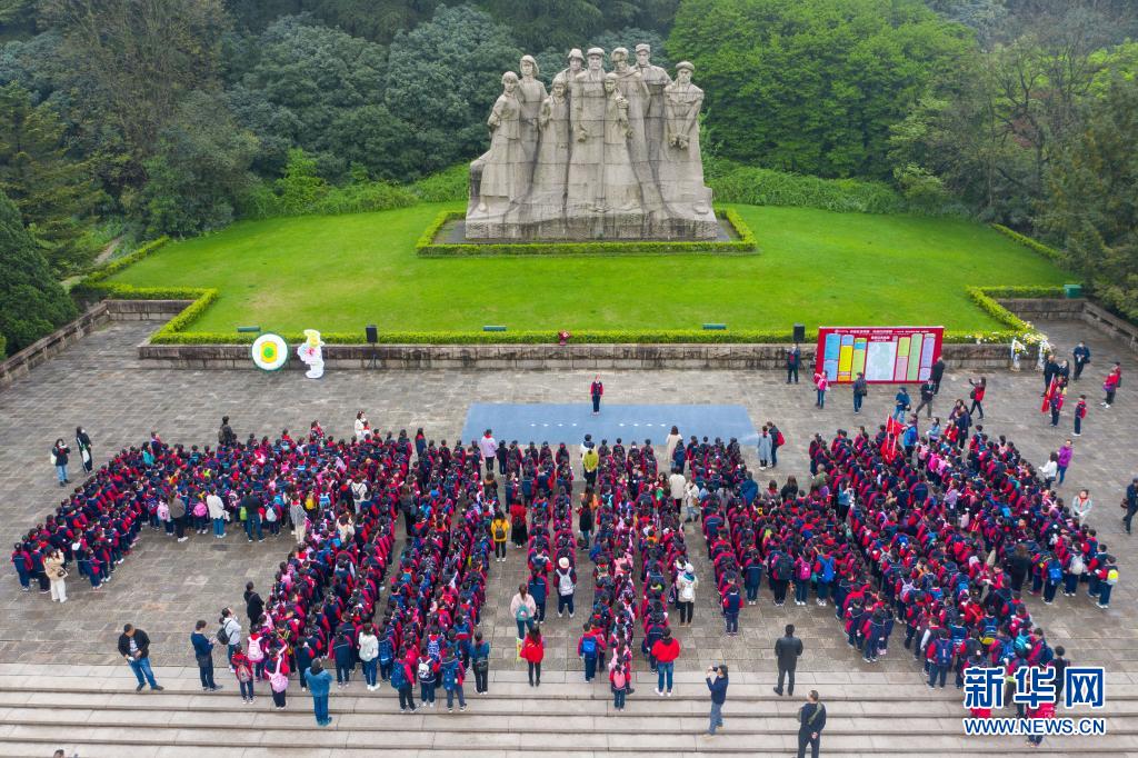 4月2日,小学生们在南京雨花台烈士群雕前缅怀先烈(无人机照片)。