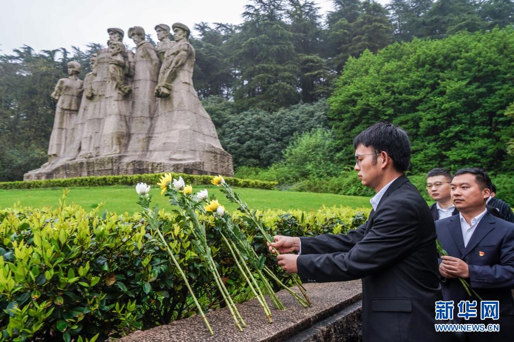 4月2日,人们在南京雨花台烈士群雕前献花、缅怀先烈。