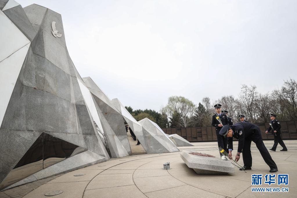 4月2日,沈阳出入境边防检查站民警向沈阳抗美援朝烈士陵园内的纪念雕塑献花。