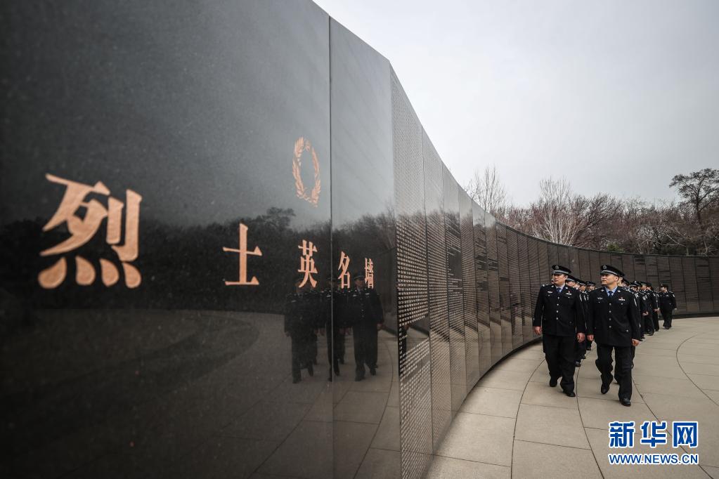 4月2日,沈阳出入境边防检查站民警在沈阳抗美援朝烈士陵园内瞻仰烈士英名墙。