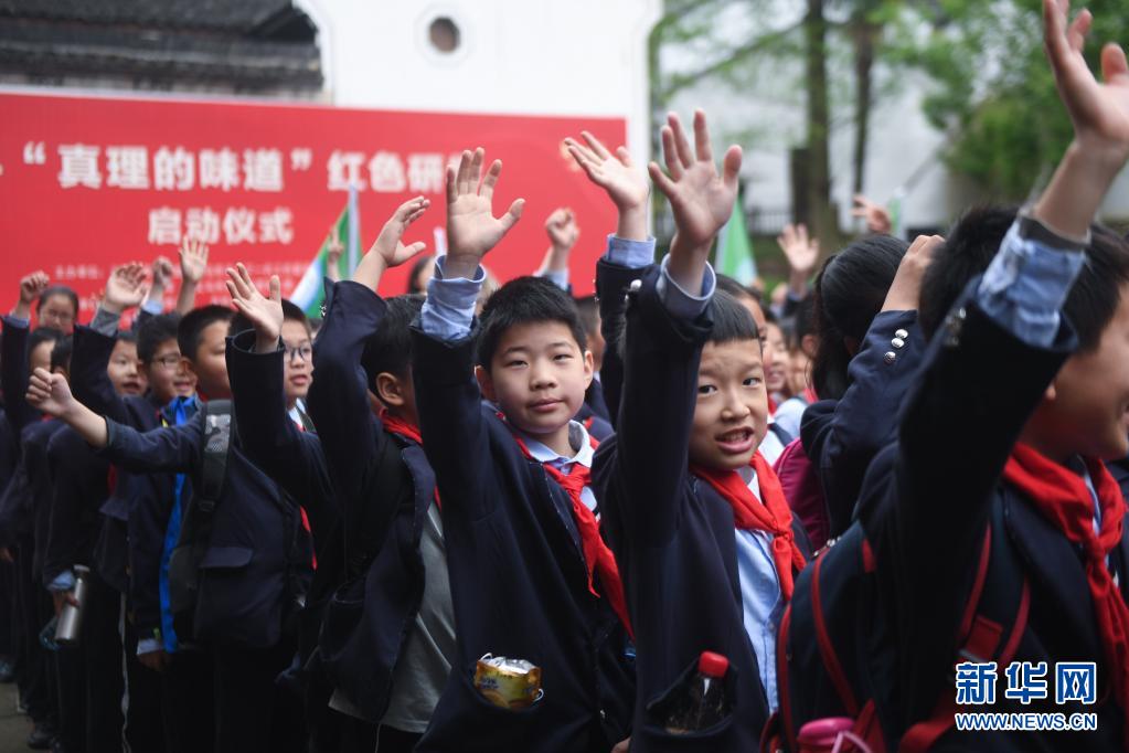 4月2日,义乌市江湾小学的学生们在义乌市城西街道分水塘村参加红色研学之旅的启动仪式。