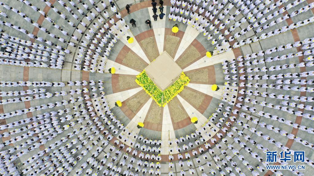 4月2日,宁夏医科大学学生在“生命之柱”前默哀(无人机照片)。