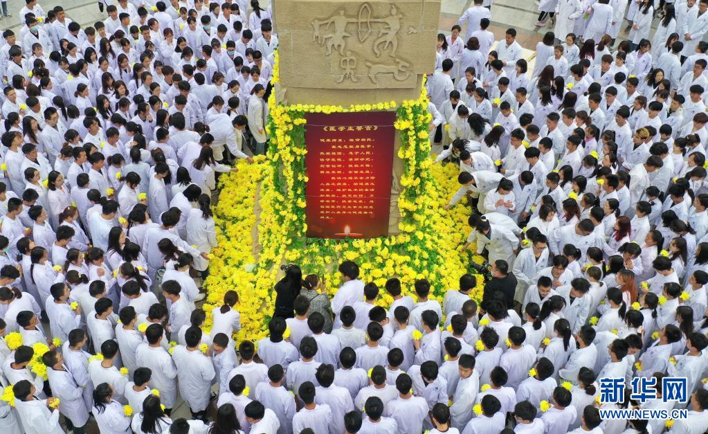 4月2日,宁夏医科大学学生向“生命之柱”献花(无人机照片)。