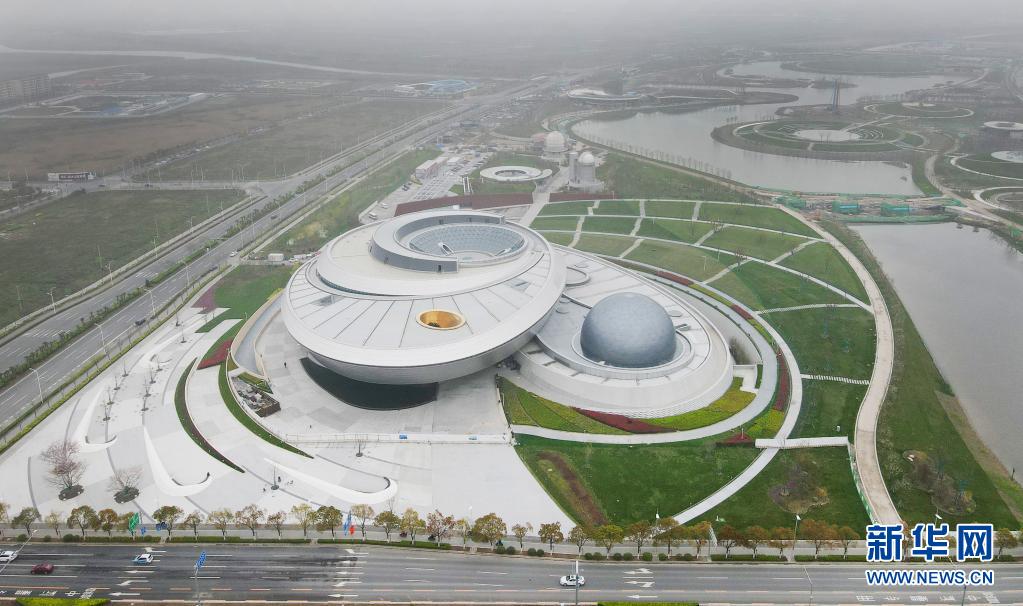 这是从空中俯瞰位于上海浦东临港的上海天文馆主体建筑(4月2日摄,无人机照片)。