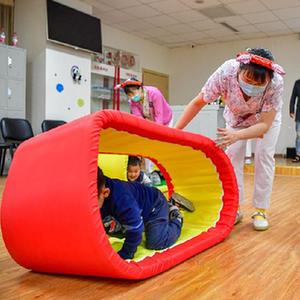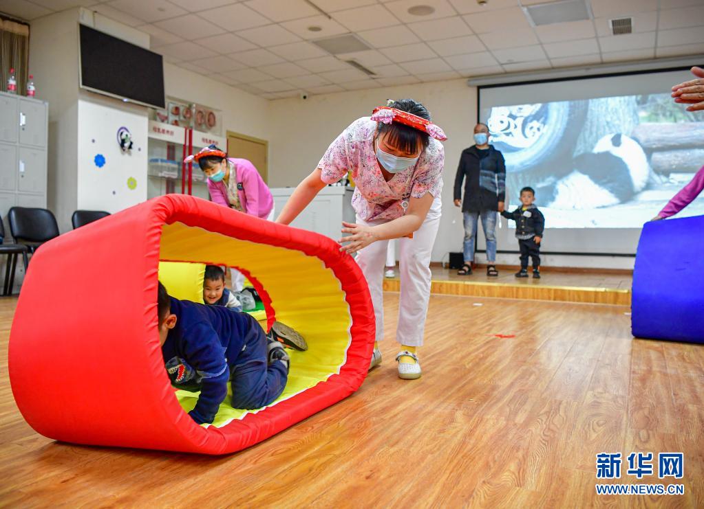 4月2日,四川省妇幼保健院的医护人员带领自闭症儿童做一些有益于康复的游戏。