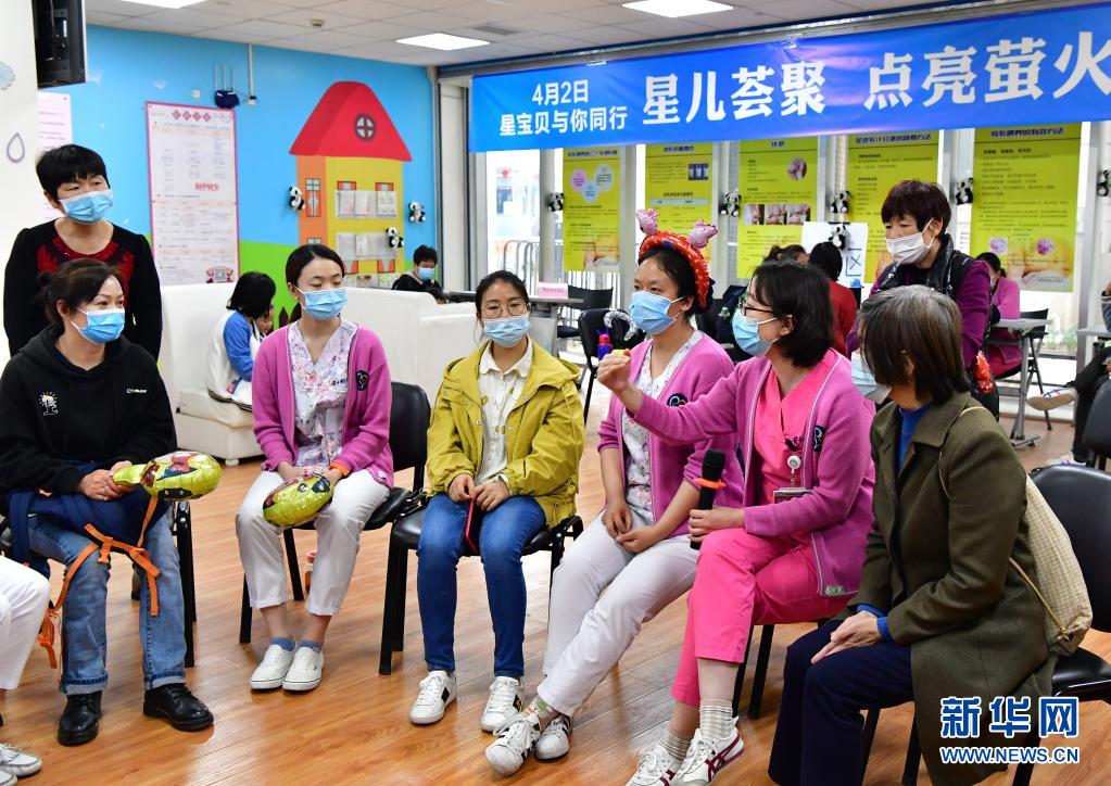 4月2日,医护人员向参与活动的自闭症儿童家长介绍家庭配合治疗的方法。