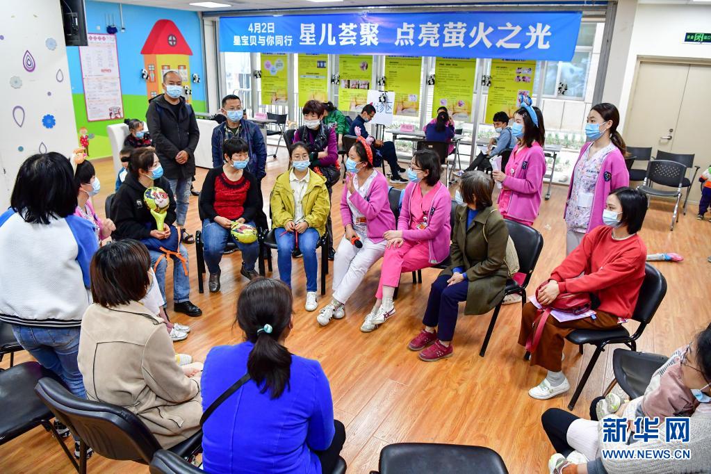 4月2日,医护人员向参与活动的自闭症儿童家长介绍家庭配合治疗的方法。