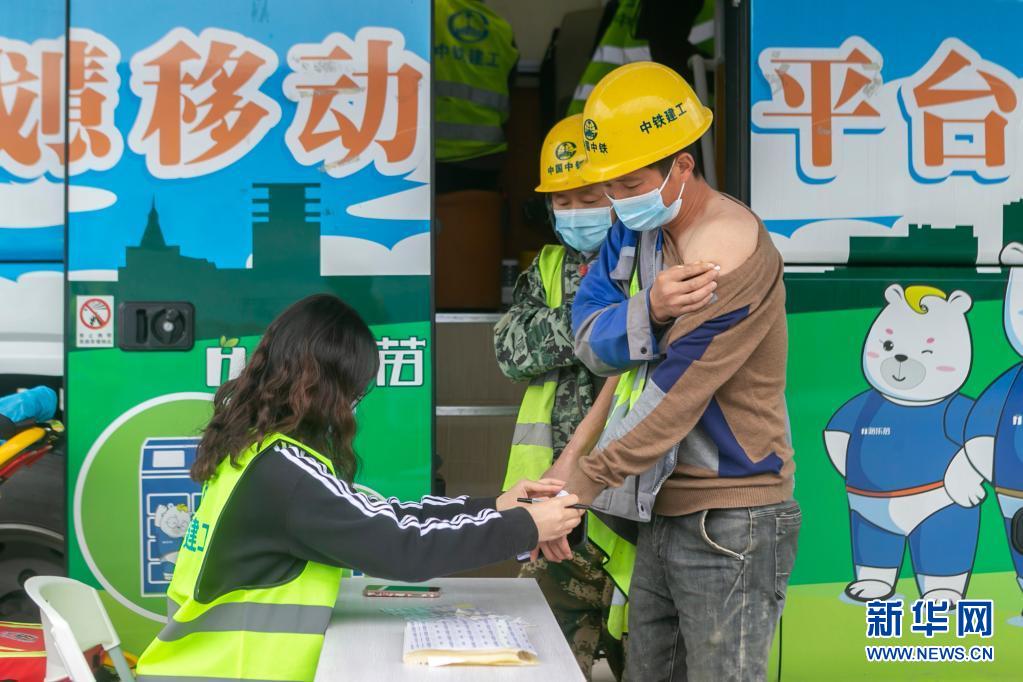 4月2日,工作人员为接种疫苗的工友贴上记录留观时间的贴纸。
