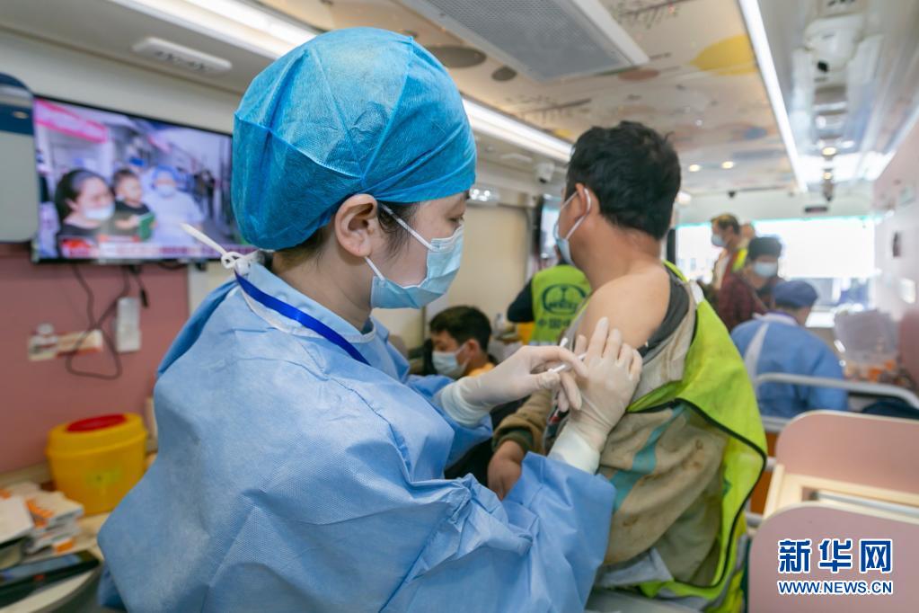 当日,一辆移动预防接种车来到中铁建工集团上海九星城项目工地,为项目工作人员进行新冠疫苗免费接种服务。这辆移动预防接种车设有2个固定接种单元,接种条件与定点接种单位相同。现场设置了等待区、预检区、疫苗接种区以及留观区,800余名项目工作人员分批次有序进行疫苗接种。