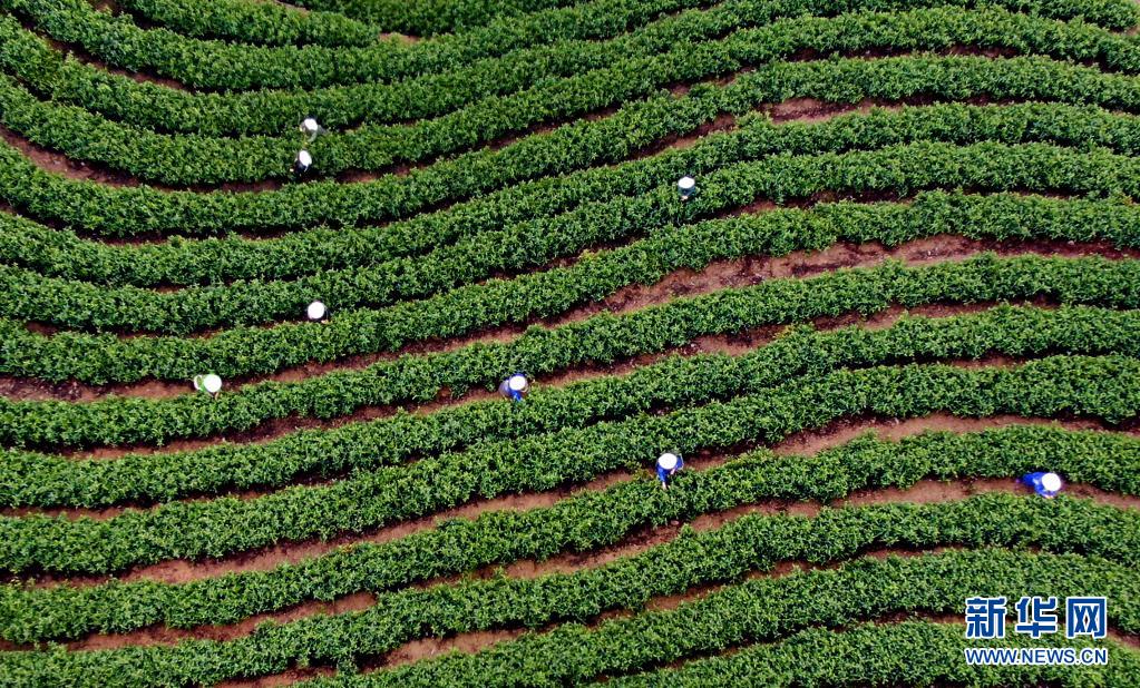 4月2日,茶农在河南省信阳市商城县苏仙石乡东河村的一个茶园内采摘茶叶(无人机照片)。