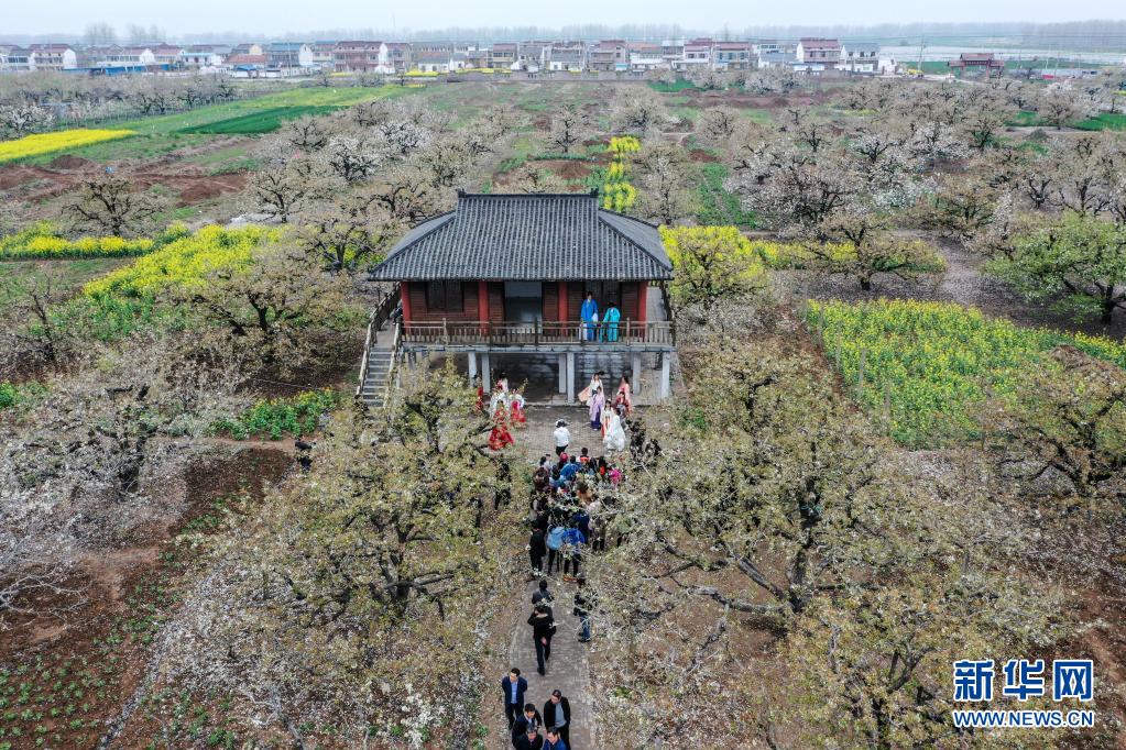 4月2日,游客在江苏省滨海县现代农业产业园区“梨花语”景区观看文艺表演(无人机照片)。