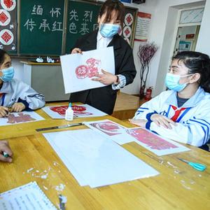 4月2日,乌鲁木齐市第三十八中学七年级学生在美术老师王雲美(右二)指导下,制作主题剪纸作品。
