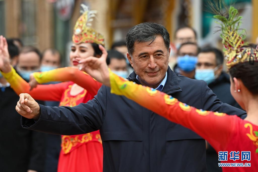 在新疆国际大巴扎,上海合作组织秘书长诺罗夫与舞蹈演员一起跳新疆舞(3月30日摄)。