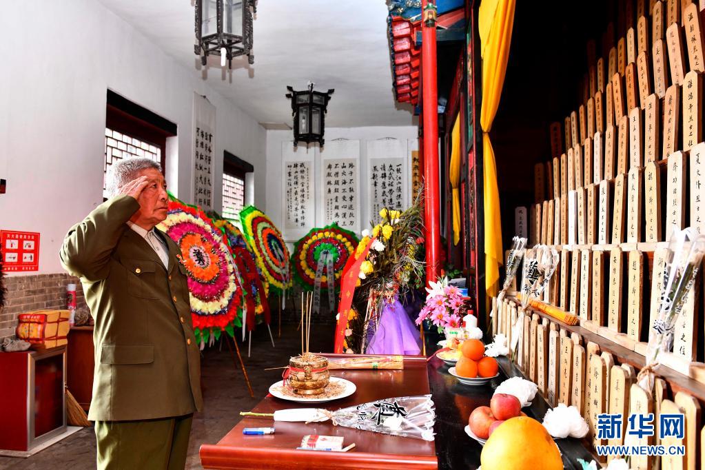 4月2日,在昌邑市抗日殉国烈士祠,管理员魏铁良面向烈士牌位敬礼。