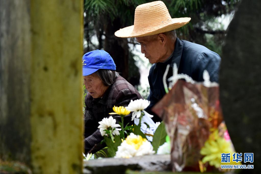 4月1日,叶观山和妻子戴小菊在水龙烈士墓前整理瞻仰者敬献的鲜花。