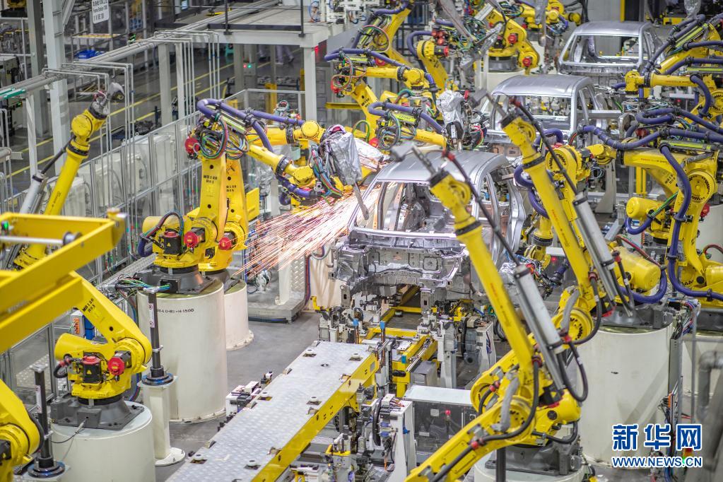 4月2日,在重庆金康赛力斯两江智能工厂焊装车间,点焊机器人在对车身线进行焊接作业。