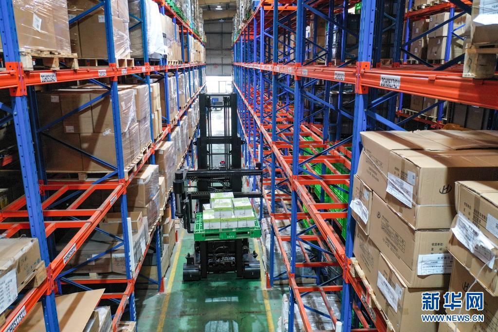 3月31日,在重庆长安民生物流股份有限公司,无人叉车在码放货品(无人机照片)。