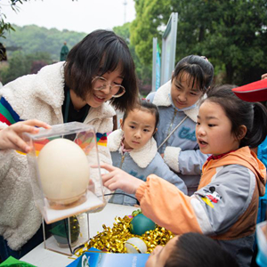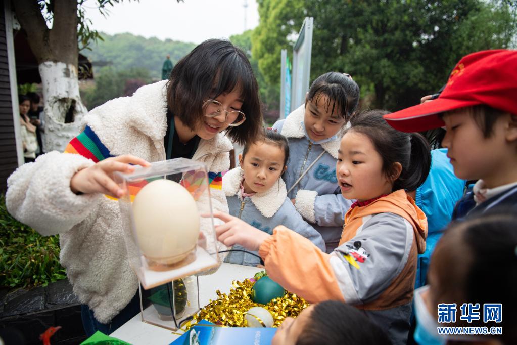 4月3日,长沙生态动物园工作人员(左一)给孩子们介绍蛋壳标本。