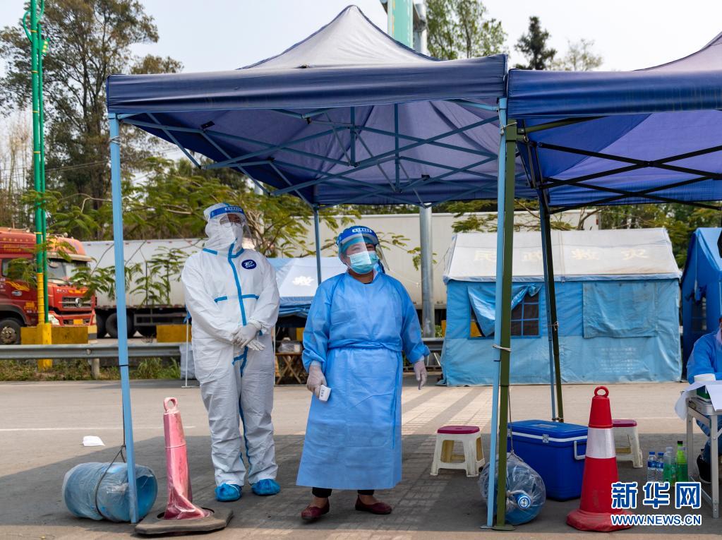 3月31日,杨保丽(右)和同事值守在杭瑞高速瑞丽东收费站疫情防控卡点。