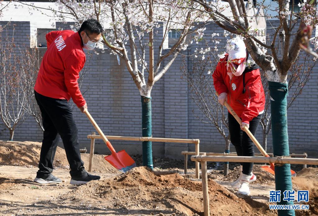 4月3日,参加植树活动人员在北京冬季奥林匹克公园植树。