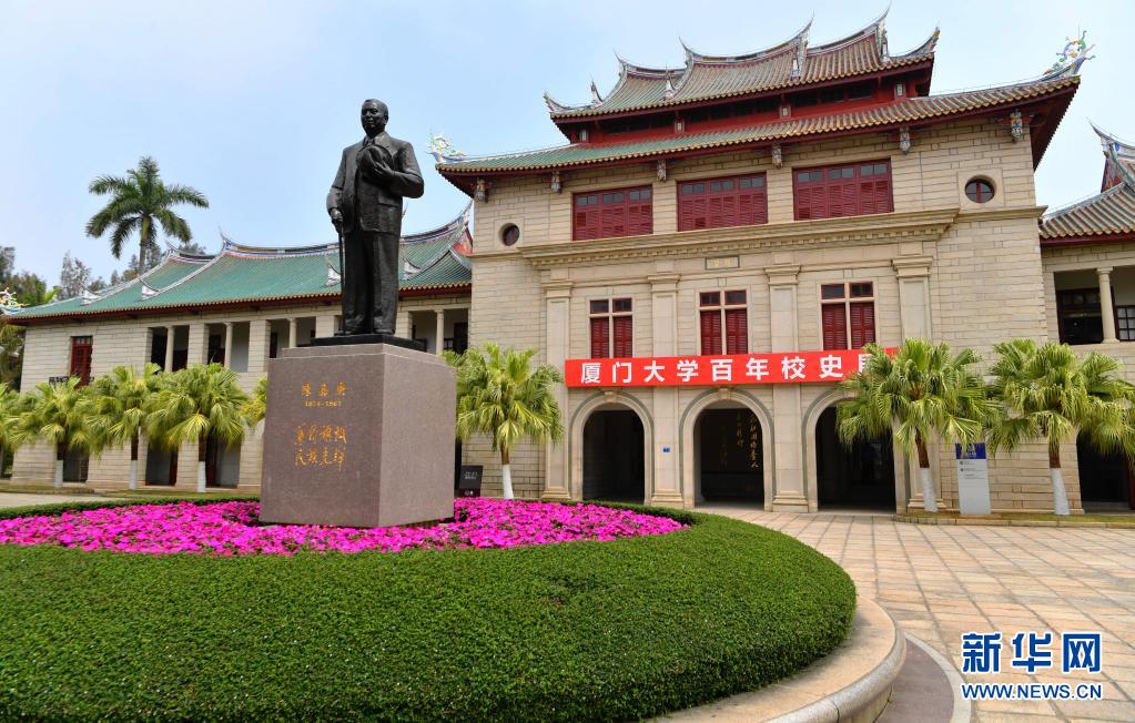 这是位于厦门大学校园里的陈嘉庚雕像。雕像的背后,一座座“穿西装、戴斗笠”的嘉庚风格建筑分外醒目。这是陈嘉庚先生的独创:西式楼身,加上覆盖橙色“嘉庚瓦”或绿筒瓦的中式坡形屋顶(4月2日摄)。新华社记者 魏培全 摄