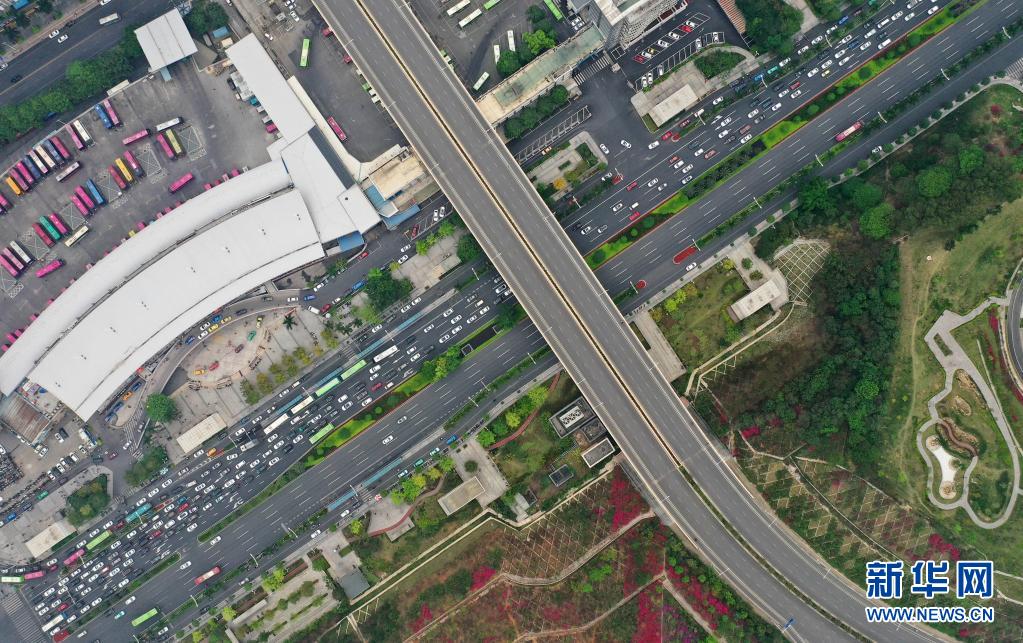 4月3日,在广西南宁市民族大道出城方向,大量车辆排队等候通行(无人机照片)。当日是清明小长假第一天,广西多地迎来出行车流高峰。新华社记者 黄孝邦 摄
