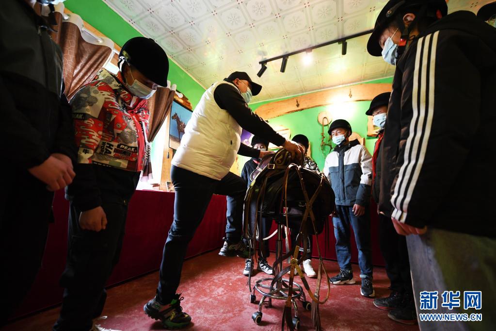 这是窝依莫克镇寄宿制中学马术教练阿不都克依木·阿不都热依木(左三)为学生讲解马术知识(3月29日摄)。