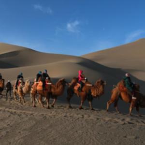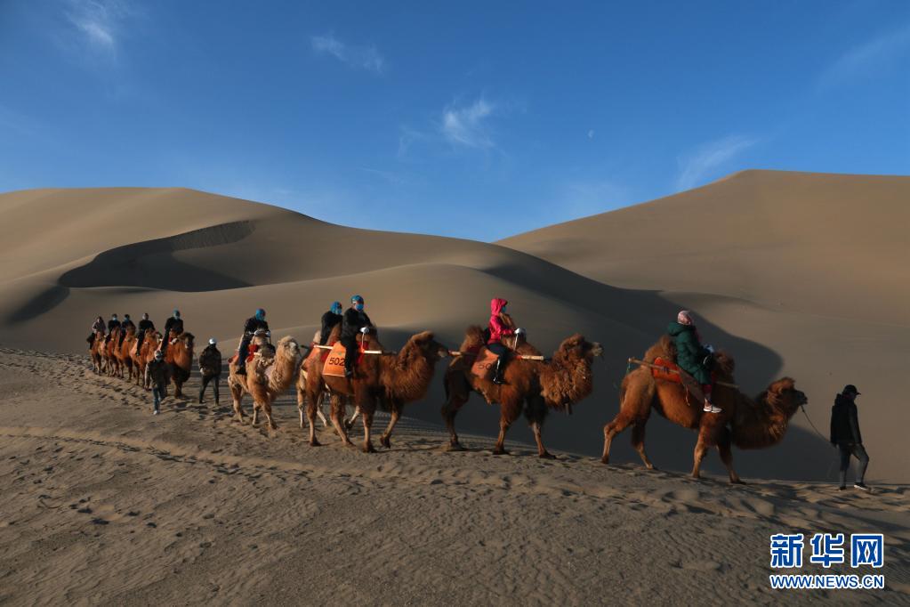 4月3日,游客在甘肃省敦煌市鸣沙山月牙泉景区游览。