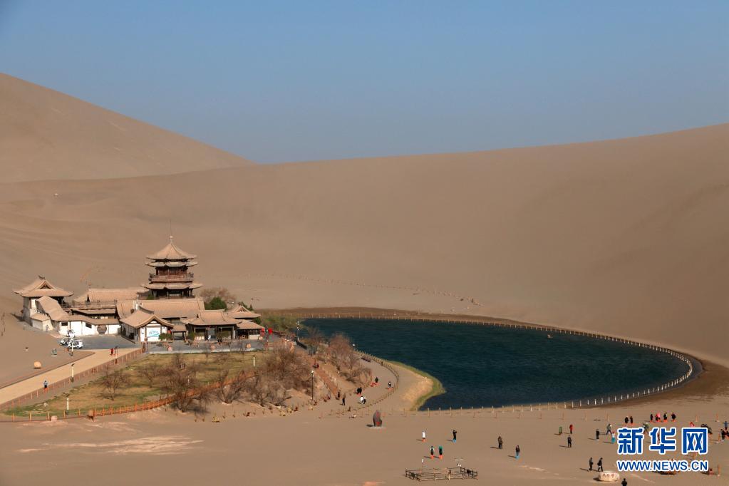 4月3日,游客在甘肃省敦煌市鸣沙山月牙泉景区游览。