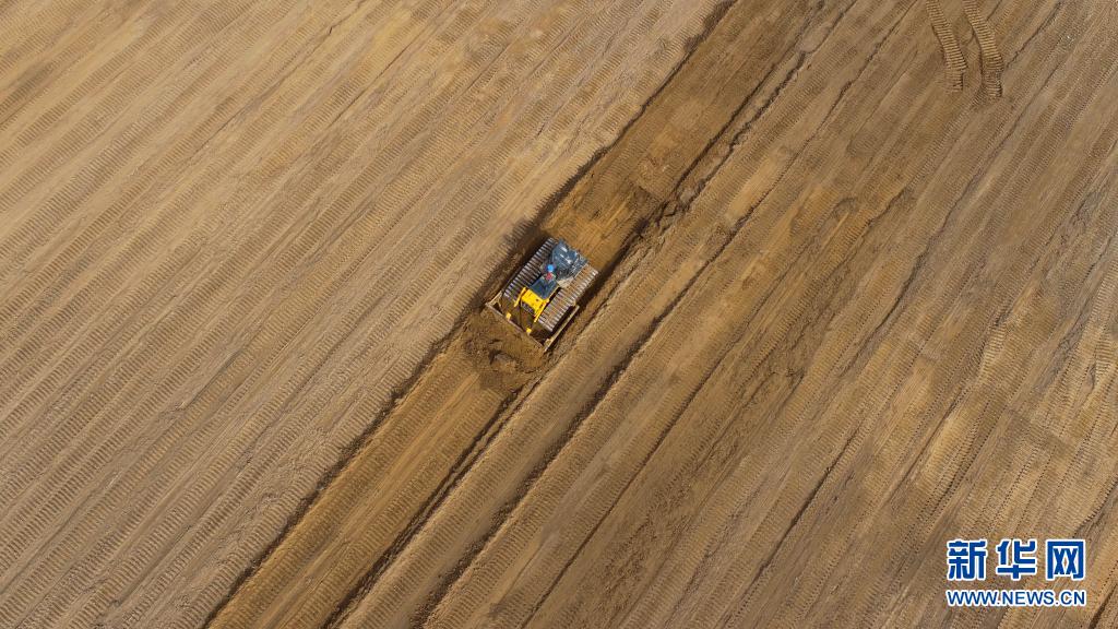 4月3日,工作人员在达拉特旗昭君镇平整土地(无人机照片)。新华社记者 张晟 摄