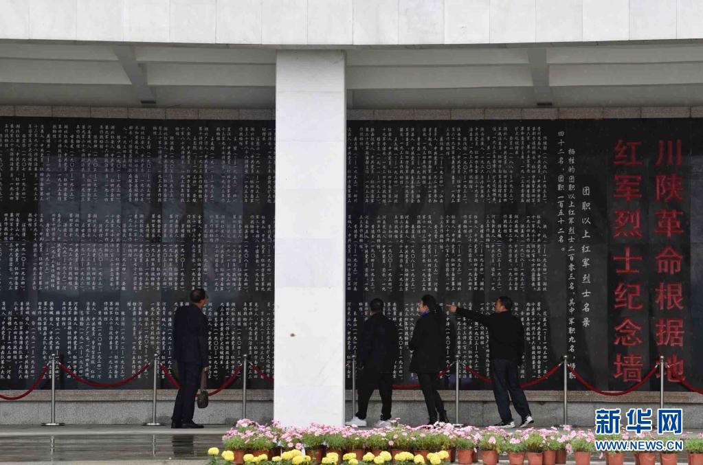 4月3日,红军烈士陈自岗的后人来到川陕革命根据地烈士陵园,在纪念墙上寻找陈自岗的信息。
