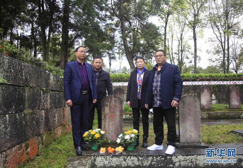 4月3日,红军烈士陈自岗的后人来到川陕革命根据地烈士陵园,与陈自岗的墓碑合影。