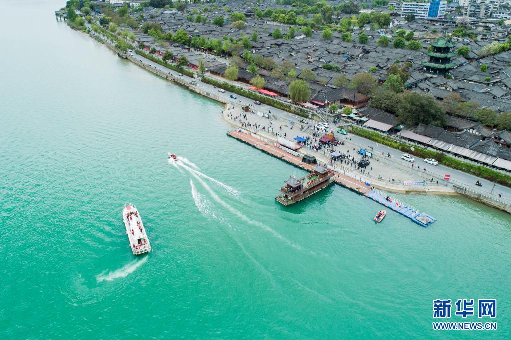 4月3日,在四川阆中古城,游客乘船游览(无人机照片)。