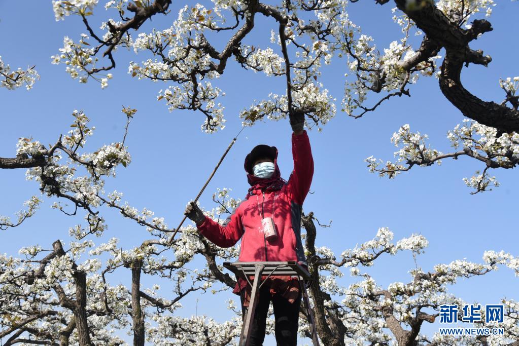 近日,河北省河间市龙华店乡2300余亩梨树进入盛花期,当地果农抢抓农时为梨树进行人工授粉,确保梨果丰收。