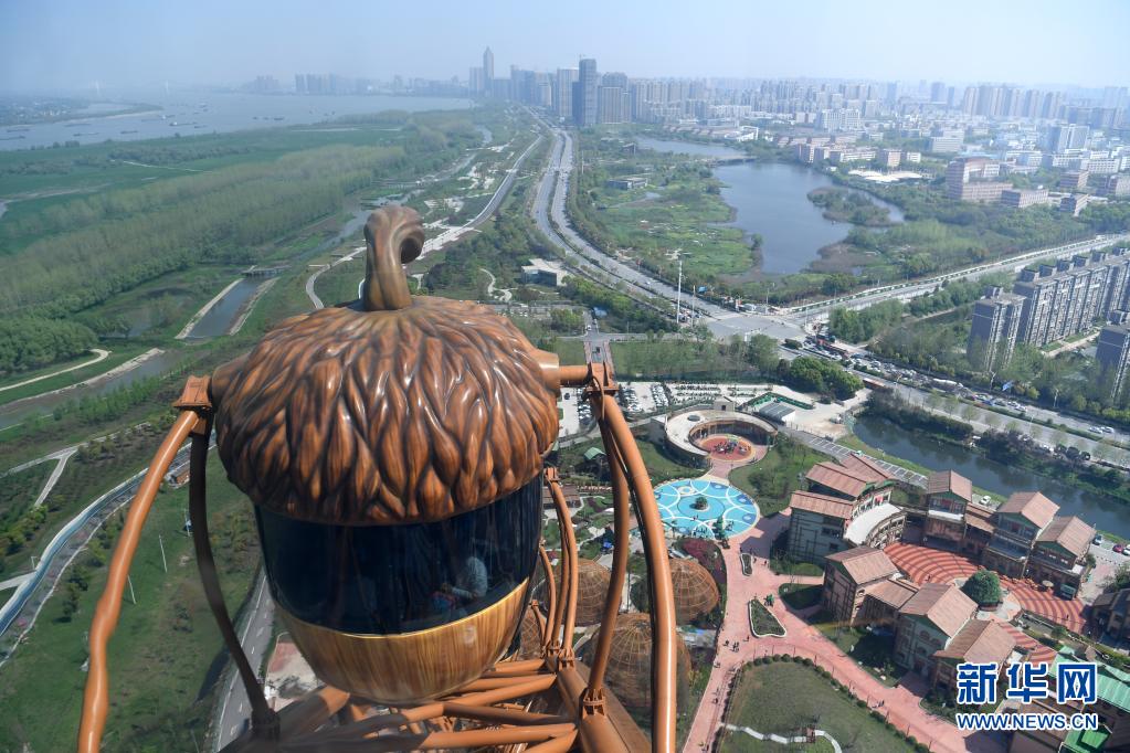 4月4日,市民在安徽省芜湖市松鼠小镇乘坐摩天轮游玩。