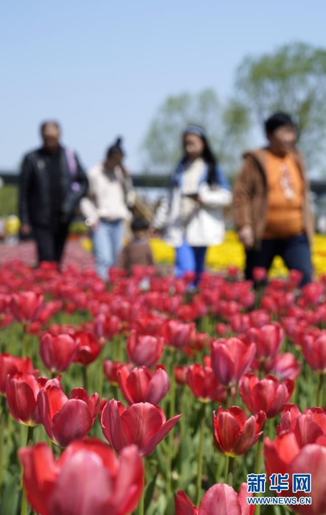 4月4日,游客在山东省滨州市秦皇河公园内观赏盛开的郁金香。