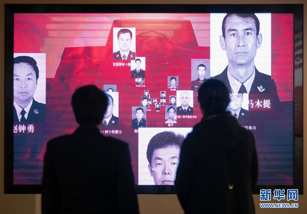 4月3日,玛依努尔(右)在新疆警史馆参观,祭奠英烈。