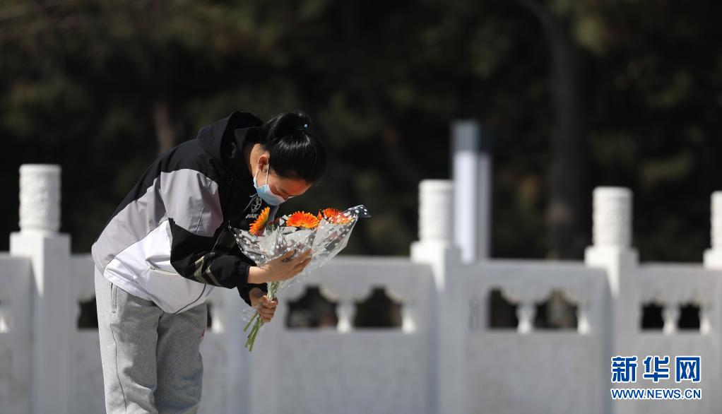 4月4日,一名学生向沈阳抗美援朝烈士陵园纪念碑鞠躬祭拜。