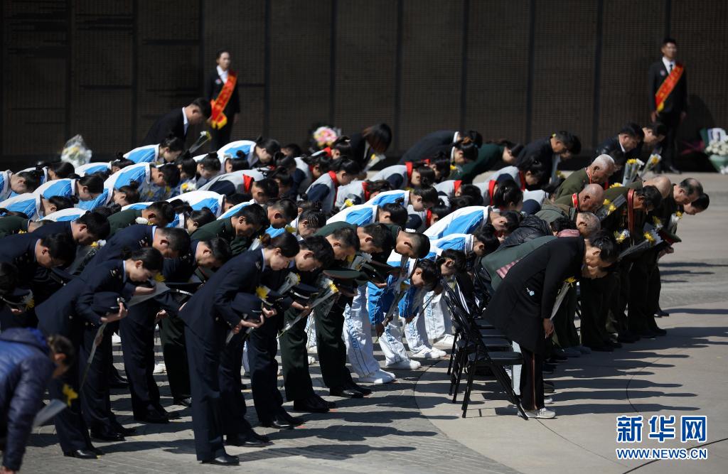 4月4日,志愿军老战士代表和祭扫者代表向沈阳抗美援朝烈士陵园烈士英名墙鞠躬祭拜。