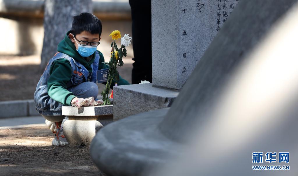 4月4日,一名小朋友在陵园里为烈士墓擦拭墓碑。