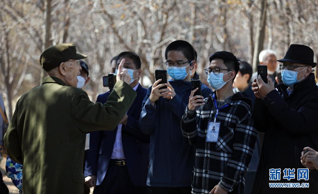 4月4日,一位志愿军老战士为周围人讲战斗故事。