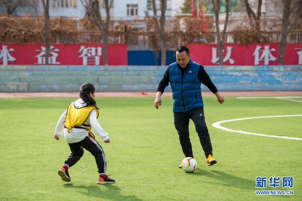 夏松豪(右)与学生马雨婷在训练中拼抢(3月31日摄)。新华社记者 胡虎虎 摄