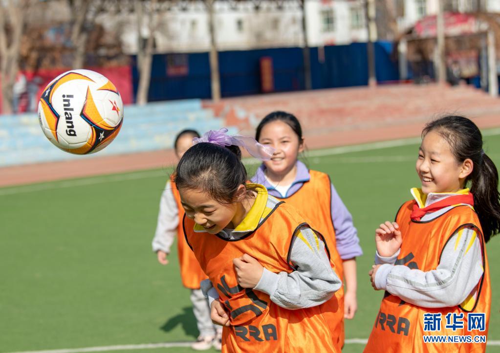 新疆沙湾二小的学生郑雅静(前)在训练间隙尝试顶头球(4月1日摄)。新华社记者 胡虎虎 摄