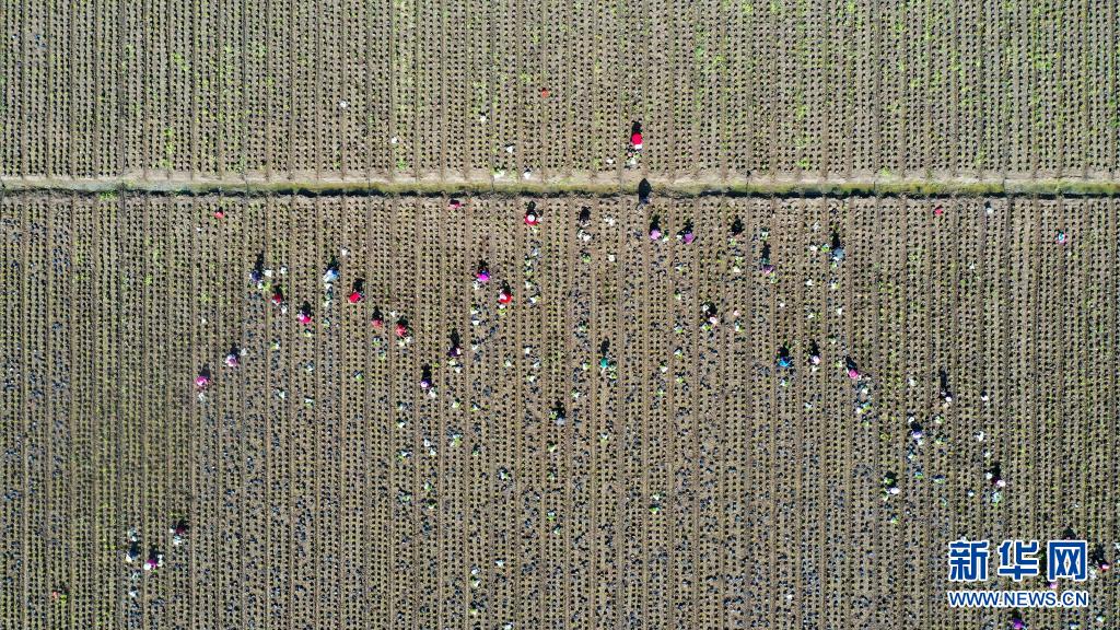 4月5日,江苏省宿迁市沭阳县刘集镇南长庄村农民在田间劳作(无人机照片)。