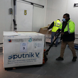 4月4日,工作人员在利比亚首都的黎波里搬运首批抵达的新冠疫苗。